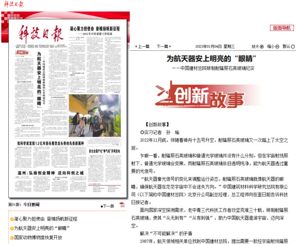 2023年1月4日,总院在《科技日报》头版头条发表专题文章《为航天器安上明亮的“眼睛”》。从材料的基础性能研究到助力中国航天器遨游宇宙、迈向深空,顾真安院士带领总院科技工作者攻坚克难三十载,研制耐辐照石英玻璃,使其“从无到有”“从有到强”。小料带你一起去了解下吧~