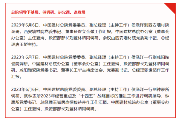 佟立金在汇报中表示,2023年以来西安墙材院紧紧围绕年度重点工作,内抓管理外抓市场,实现合同额大幅上升,履约质量不断提高,客户粘性逐渐增强。组织制定高质量发展三年行动方案(2023-2025),在完善战略、深化改革、创新技术上不断发力,为公司持续发展奠定坚实基础。下一步,西安墙材院将继续发挥党组织引领作用,不断提升管理能力和水平,强化执行,团结协作,为全面完成2023年度各项目标任务,全力开创公司高质量发展新征程努力奋斗。