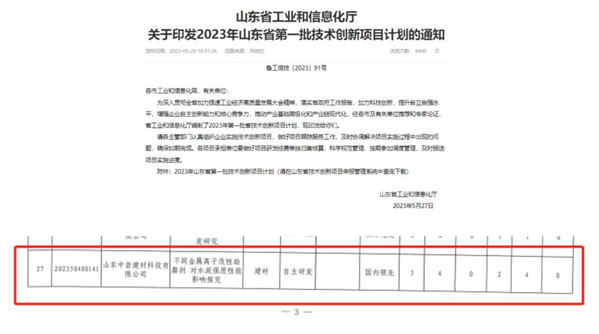 近日,山东省省工业和信息化厅组织开展了2023年山东省企业技术创新项目计划(第一批)申报工作。山东中岩凭公司自立项目——《不同金属离子改性助磨剂对水泥强度性能影响探究》申报成功。