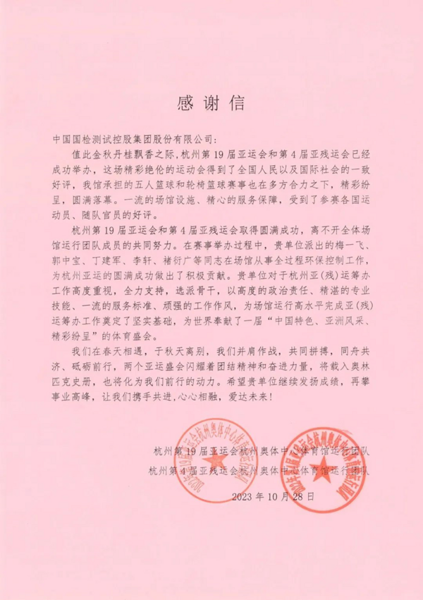 近日,国检集团收到了杭州第19届亚运会和第4届亚残运会杭州奥体中心体育馆运行团队共同发来的感谢信,感谢国检集团为杭州亚运的圆满成功做出的积极贡献。