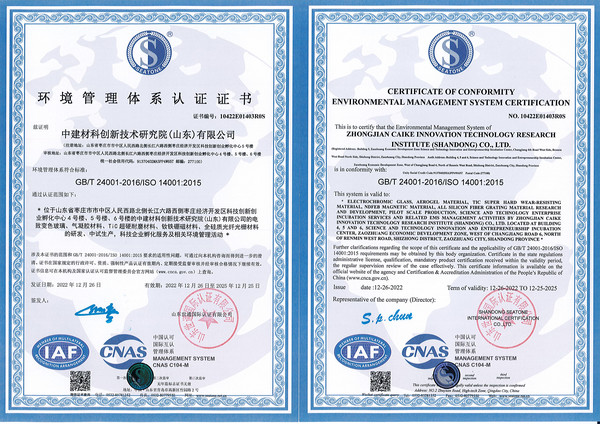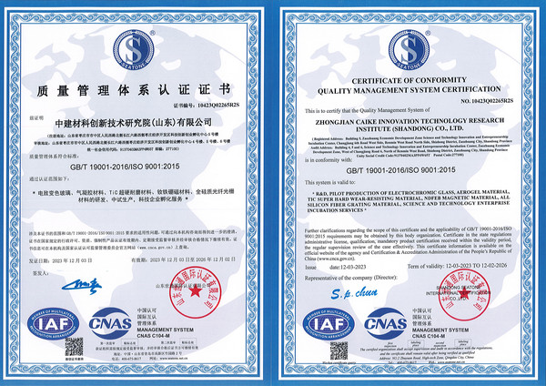 中建材科创新技术研究院(山东)有限公司顺利通过ISO 9001质量管理体系再认证和ISO 14001环境管理体系、ISO 45001职业健康安全管理体系年度监审,并取得相应认证证书及监审标识。