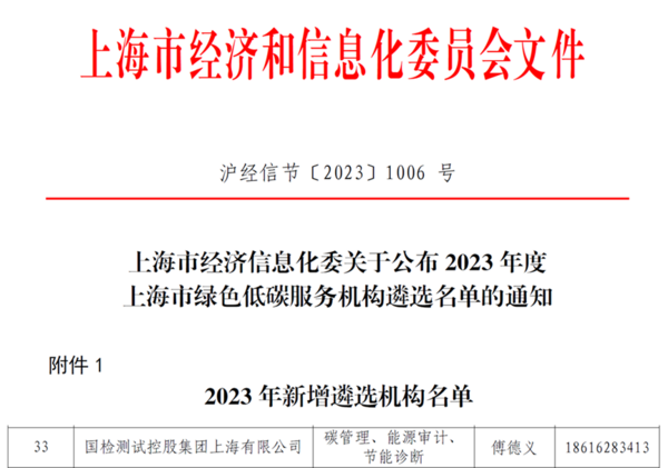 上海市经济信息化委公布“2023年度上海市绿色低碳服务机构遴选名单”,上海公司成功入选。