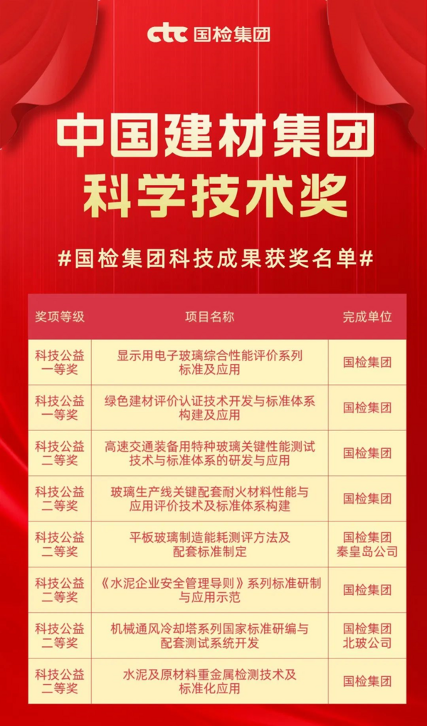 近日,2023年度中国建材集团科学技术奖获奖项目公布,国检集团共8项科技成果荣获中国建材集团科学技术奖科技公益类,其中一等奖2项、二等奖6项。