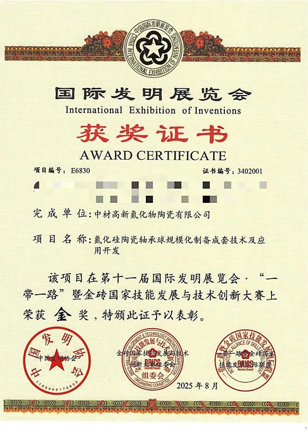近日,第十一届国际发明展览会暨“一带一路”金砖国家技能发展与技术创新大赛在广州举行。中国建材总院所属中材氮化物携项目《氮化硅陶瓷轴承球规模化制备成套技术及应用开发》精彩亮相,凭借前沿的技术创新性与应用价值,从众多参展项目中脱颖而出,一举斩获本届展览会金奖。