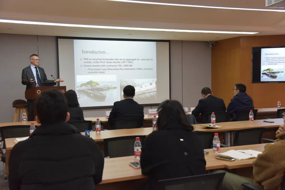 Peter Robery院士以“低碳混凝土的性能、耐久性及挑战”为题作学术讲座。他结合四十余年的实践经验,系统梳理了水泥混凝土技术近两百年的演进脉络,重点阐述了近二十年水泥混凝土低碳发展的突破——低温制备工艺与多元掺合料推动传统水泥生产升级。围绕粒化高炉矿渣(GGBS)、石灰石煅烧粘土水泥(LC3)及碱激发胶凝材料(AACMs)等方面,深入解读了国际最新研究进展及创新挑战,并结合实际工程劣化案例,提出“结构与耐久性设计并重”理念,同时给出优化防护的技术建议。